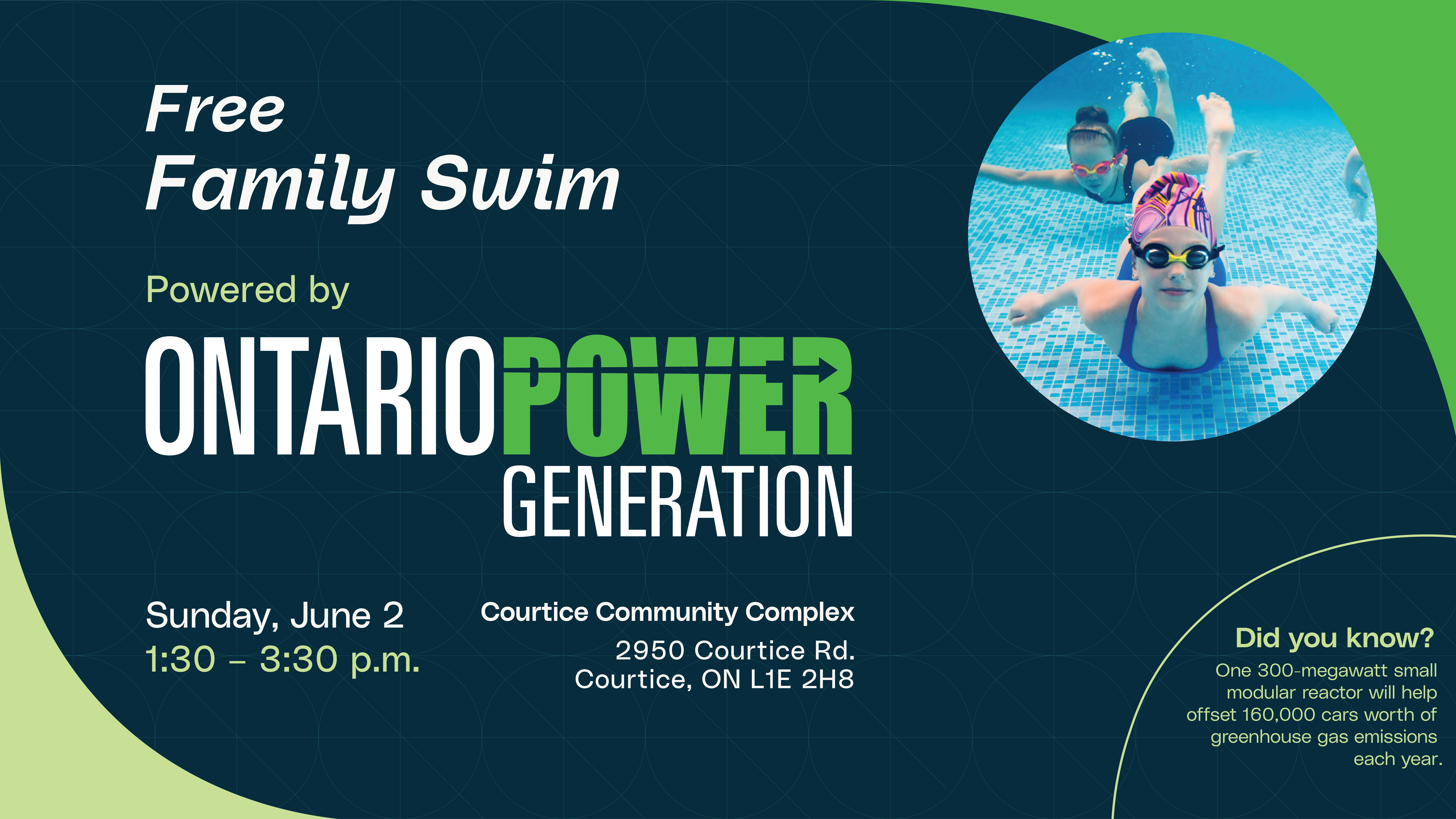 Join us at the Courtice Community Complex on Sunday, June 2 for a free family swim, courtesy of OPG’s Darlington New Nuclear Project. Meet with members of the project team and learn a little bit more about how OPG is leading the way in the advancement of Small Modular Reactor (SMR) technology in Canada – the future of nuclear power generation.