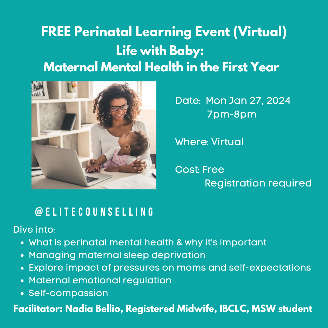 Join our FREE Virtual Perinatal Learning Event on Maternal Mental Health in the First Year with facilitator Nadia Bellio, Registered Midwife, IBCLC, MSW student.