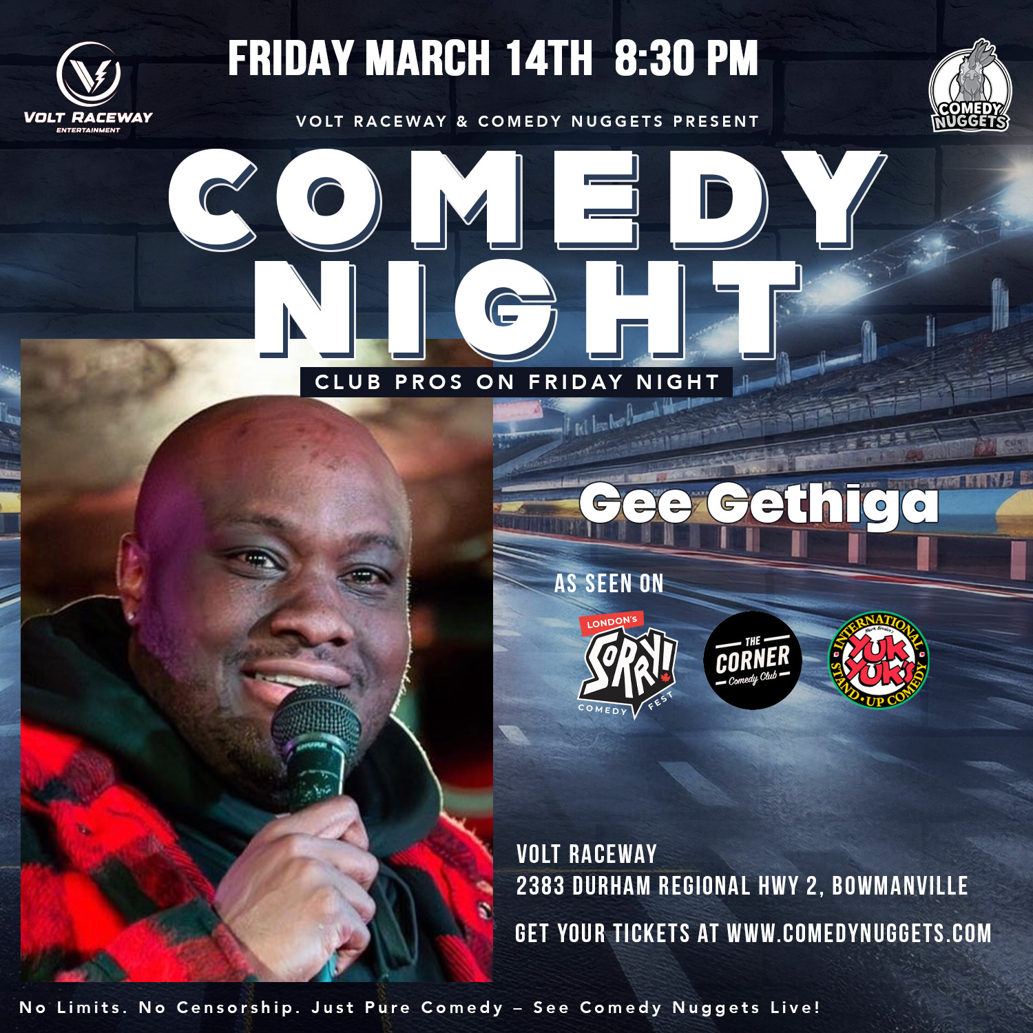 On Friday, March 14, at 8:30 PM, we’re bringing a must-see comedy show to Volt Raceway in Bowmanville. Gee Gethiga headlines.
