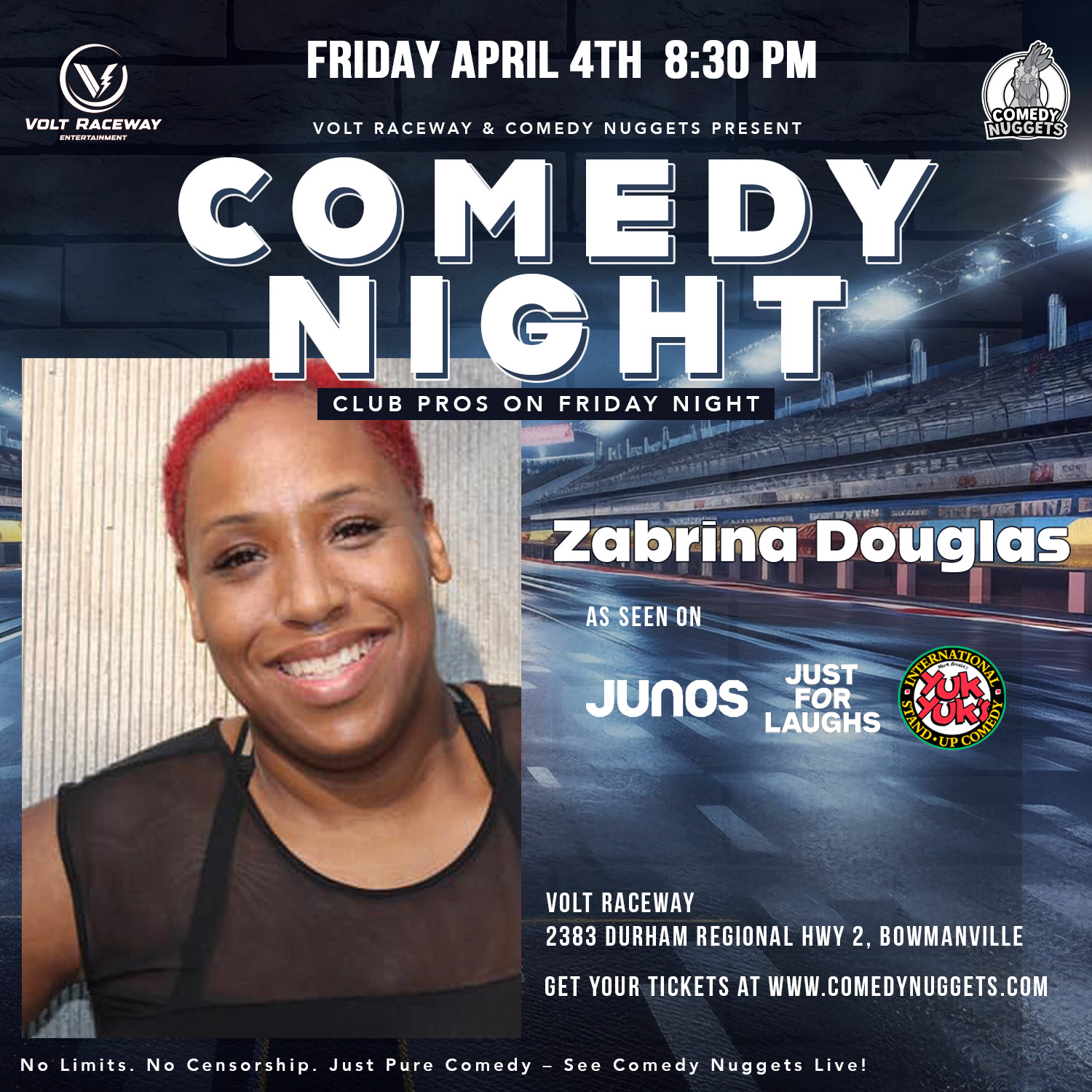 On Friday, April 4, at 8:30 PM, we’re bringing a must-see comedy show to Volt Raceway in Bowmanville. Zabrina Douglas headlines.