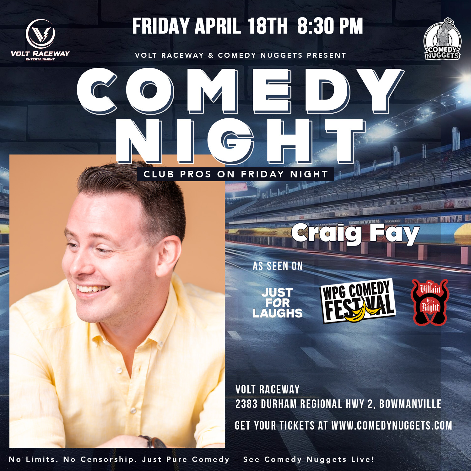 On Friday, April 18, at 8:30 PM, we’re bringing a must-see comedy show to Volt Raceway in Bowmanville. Craig Fay headlines.
