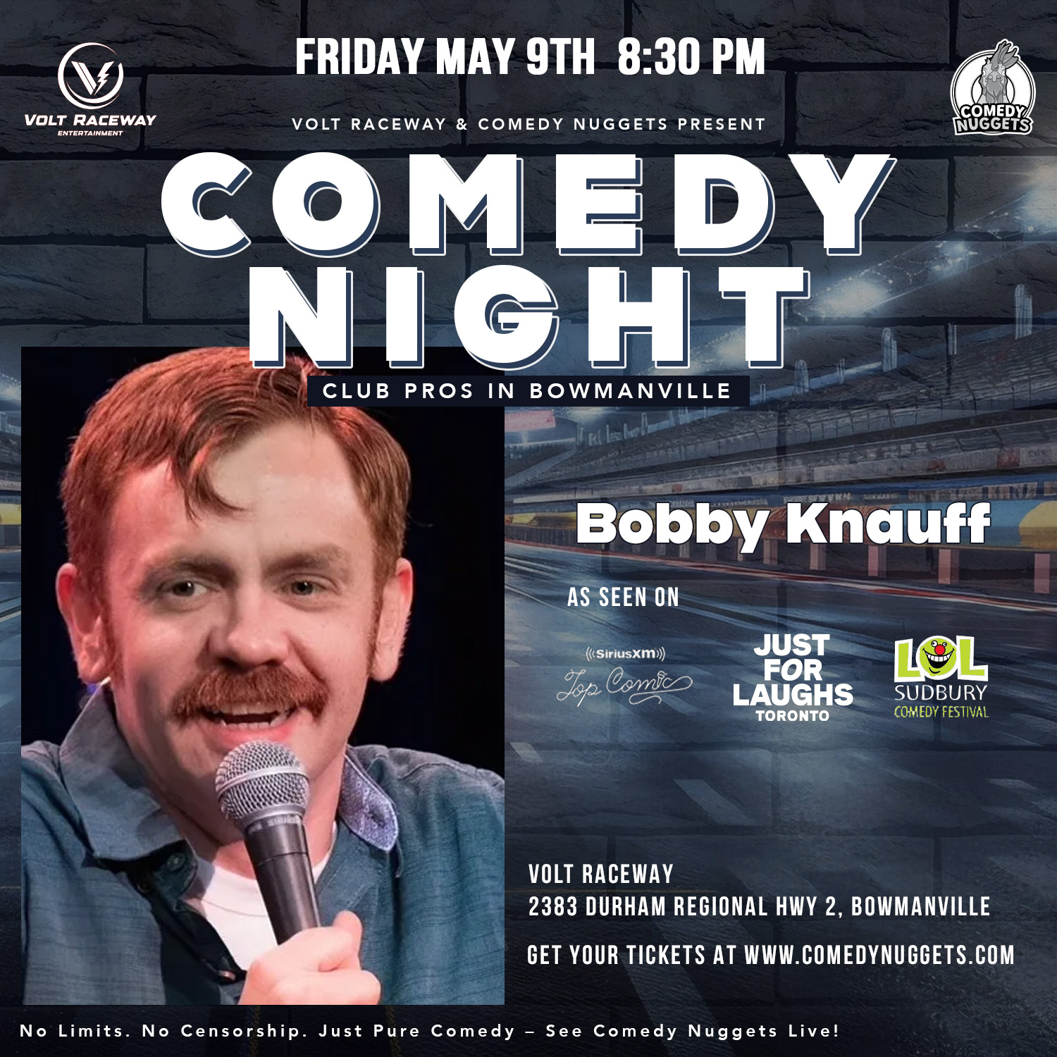 On Friday, May 9, at 8:30 PM, we’re bringing a must-see comedy show to Volt Raceway in Bowmanville. Bobby Knauff headlines.