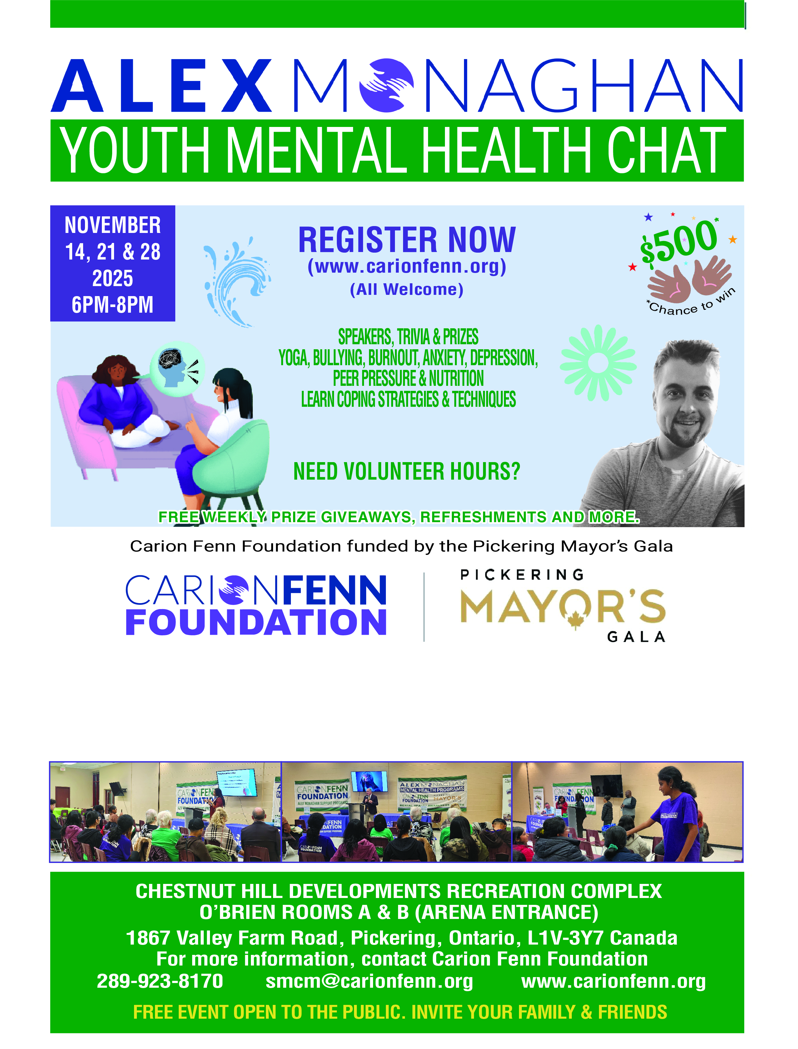 Join us for three inspiring evenings of real conversations, expert insights, and youth-led discussions focused on important mental health topics like bullying, peer pressure, burnout, stress, anxiety, depression, nutrition, protecting youth from exploitation, yoga, meditation, compassion, and empathy. Experience real stories and participate in trivia with prizes, including a chance to win the $500 Alex Monaghan Award. High school volunteer hours are available. This event is free to attend but space is limited. Register now at www.carionfenn.org. Let’s break the stigma, support mental health, and build resilience—together.