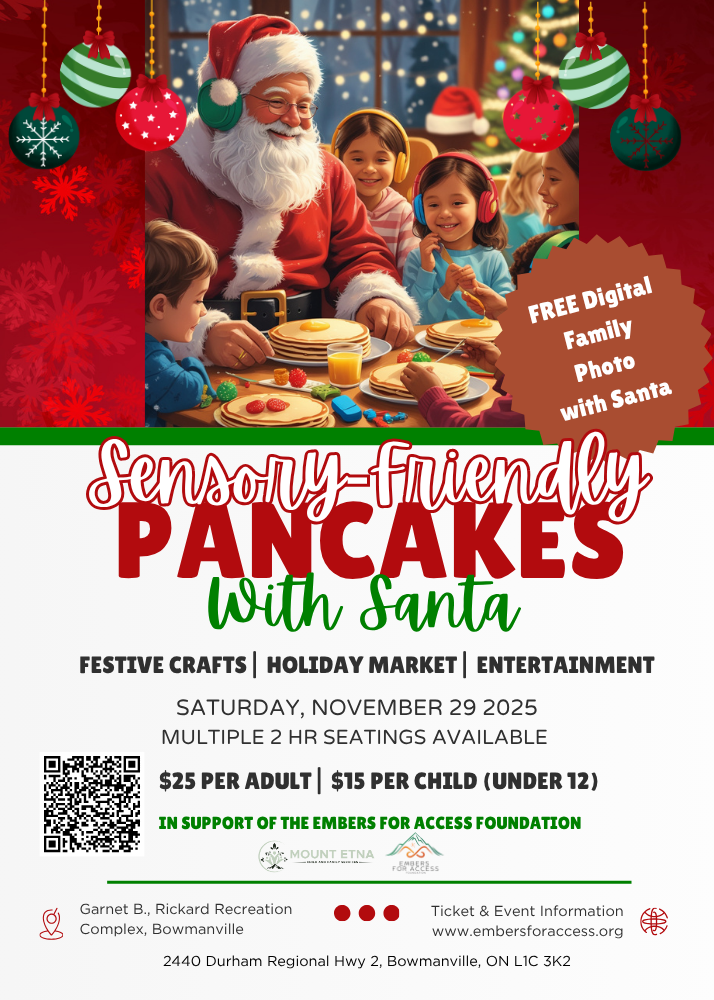 This holiday season, we’re bringing families together for a magical day that every child can enjoy. On Saturday November 29th 2025, join us for a sensory-friendly breakfast with Santa — a warm, inclusive event designed especially for ALL children. A choice of 2 hour seating, from 9:00-11:00 or 11:30-1:30pm or 2:00-4:00pm.