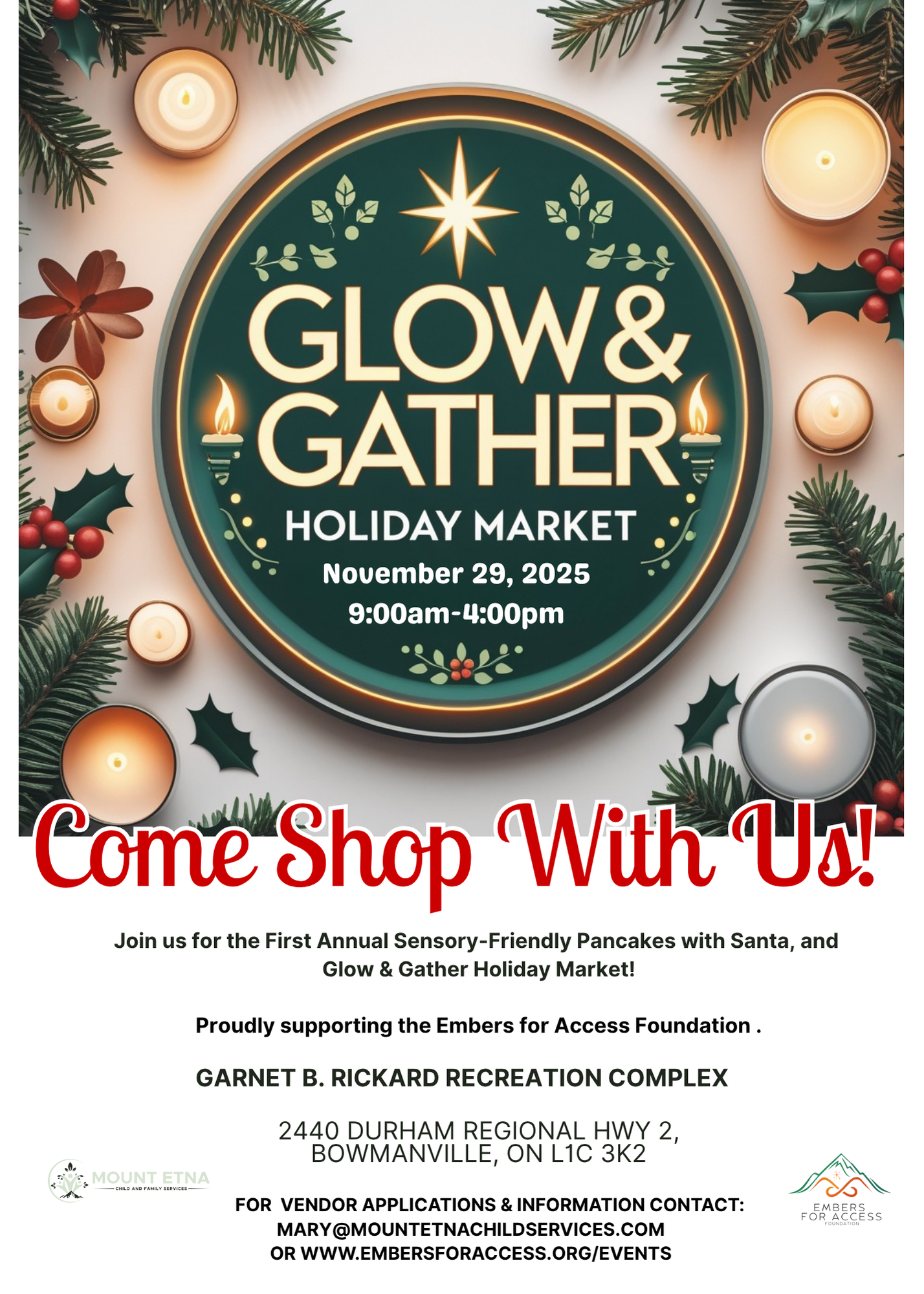Families will also enjoy access to our adjacent Glow & Gather Holiday market, featuring local artisans and community partners. Reserve your spot today by visiting our website https://www.embersforaccess.org/events, or visit our EventBrite link.