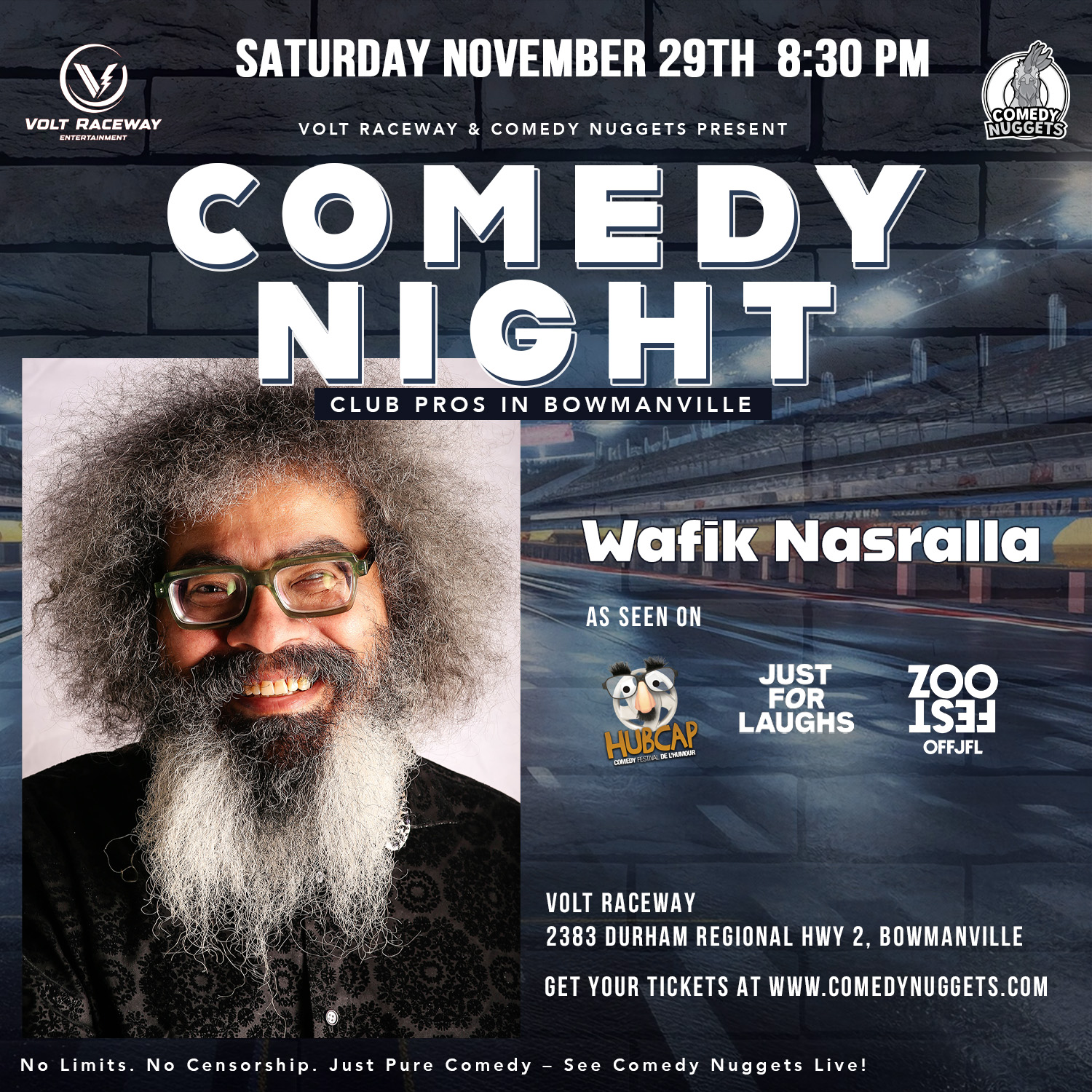 On Saturday, November 29, at 8:30 PM, we’re bringing a must-see comedy show to Volt Raceway in Bowmanville. Wafik Nasralla headlines.