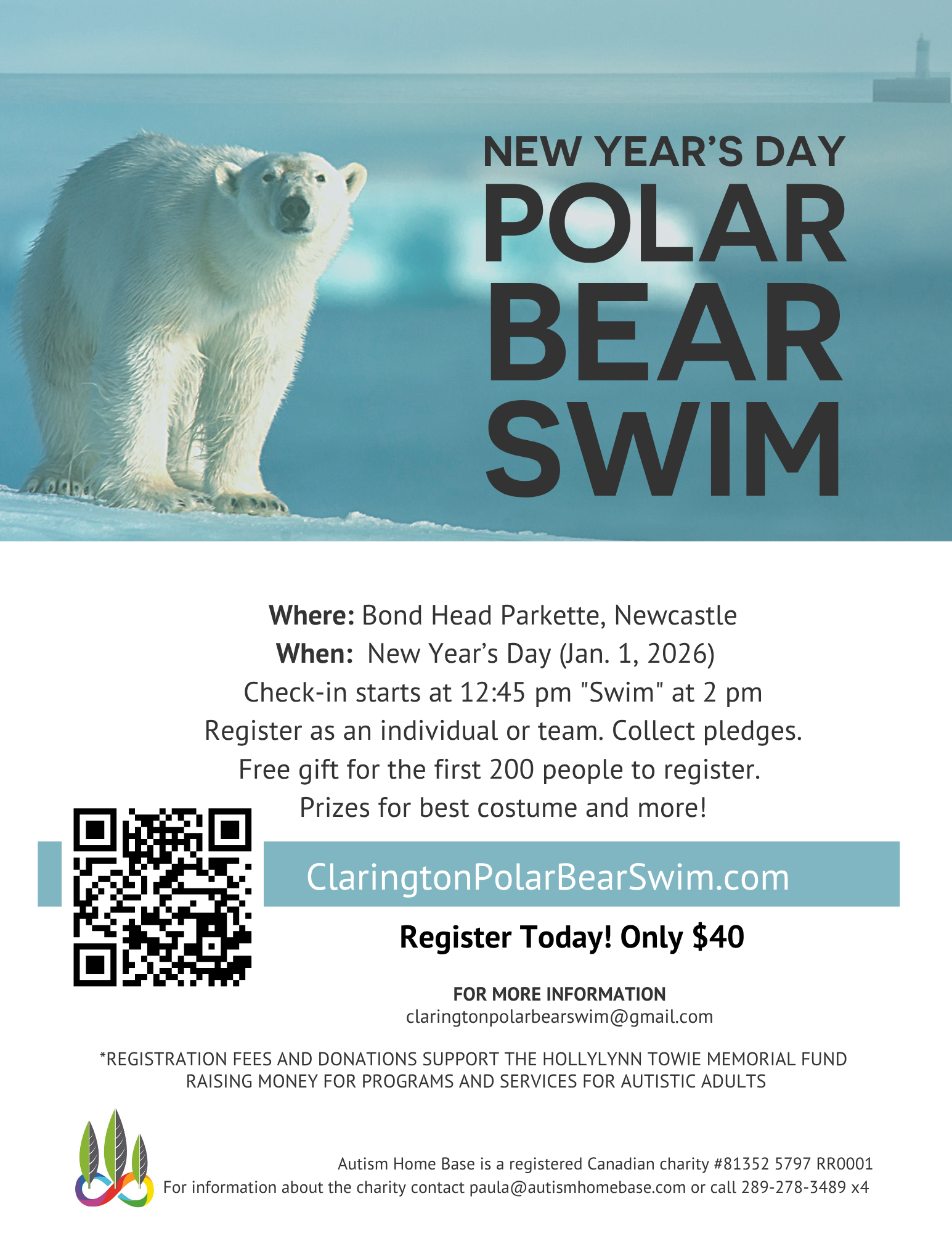 Start the New Year with a burst of adrenaline at the Annual Clarington Polar Bear Swim on January 1st. This chilly tradition isn’t just about courage, it’s about community. Every brave jump into Lake Ontario helps raise essential funds for Autism Home Base through the Hollylynn Towie Memorial Fund, supporting social and recreational programs for Autistic adults and their families.